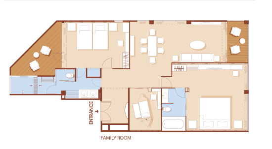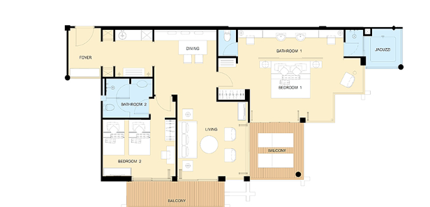 2 спальни: двуспальная кровать king-size и 2 односпальные кровати, отдельная гостиная комната, 2 ванные комнаты (в одной: гидромассажная ванна и душ, в другой: душ), 2 меблированных балкона, вид на море, план номера.
