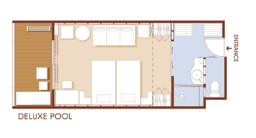 Новая категория номеров, двуспальная кровать king-size или раздельные кровати hollywood, гостиная зона с диваном, ванная комната с душем, терраса с лежаками, прямой доступ в бассейн с террасы номера, вид на бассейн, план номера.