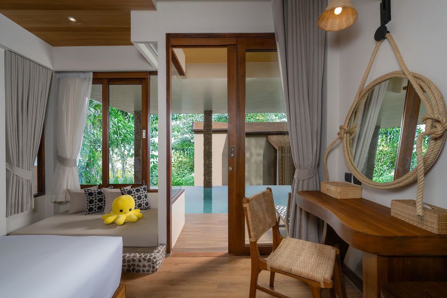 К услугам гостей — 64 стильные студии и виллы с 1–3 спальнями, каждая с собственным бассейном. В интерьерах сочетаются натуральные материалы, элементы тайской культуры и современный комфорт, создавая ощущение гармонии с природой.