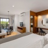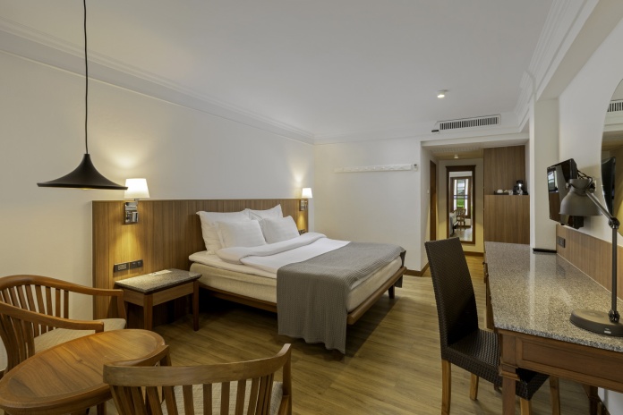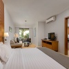 Полулюксы открытой планировки в крыле Grand, с двуспальной кроватью king size или 2-мя односпальными кроватями расположенные рядом (hollywood), гостиная зона с дополнительным спальным местом - диваном, в некоторых номерах обеденная зона со столом и стульями отделяется раздвижной дверью; отдельная ванная комната с душем и ванной; меблированный балкон; вид на бассейн/гору/сад;