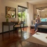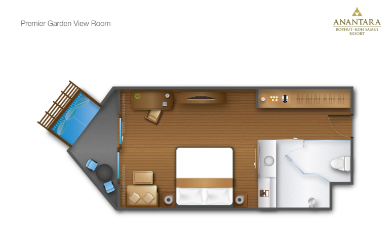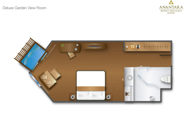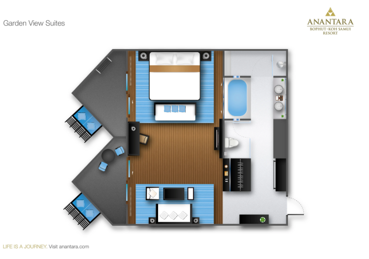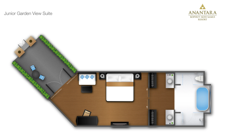 Двуспальная кровать и 2 односпальные кровати, гостиная зона с диваном-софа, ванная комната с отдельностоящей ванной и тропическим душем, меблированная терраса с выходом в сад, план номера;