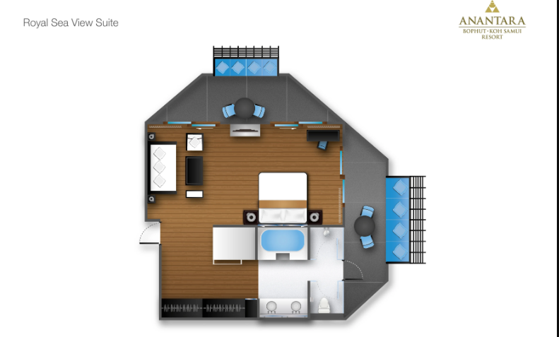 Двуспальная кровать с балдахином, просторная гостиная зона с диваном, ванная комната с ванной, меблированный балкон, панорамный вид на море, план номера;
