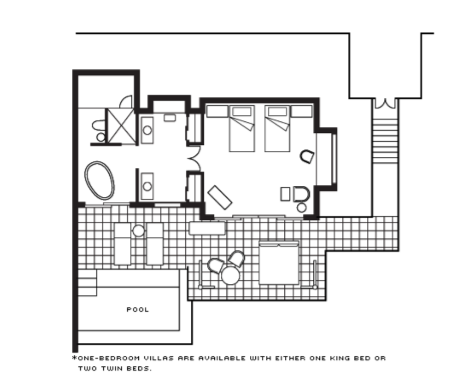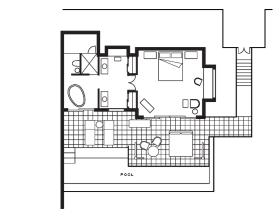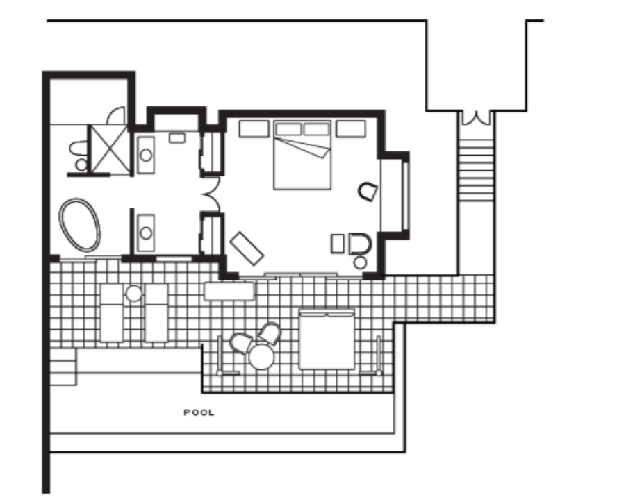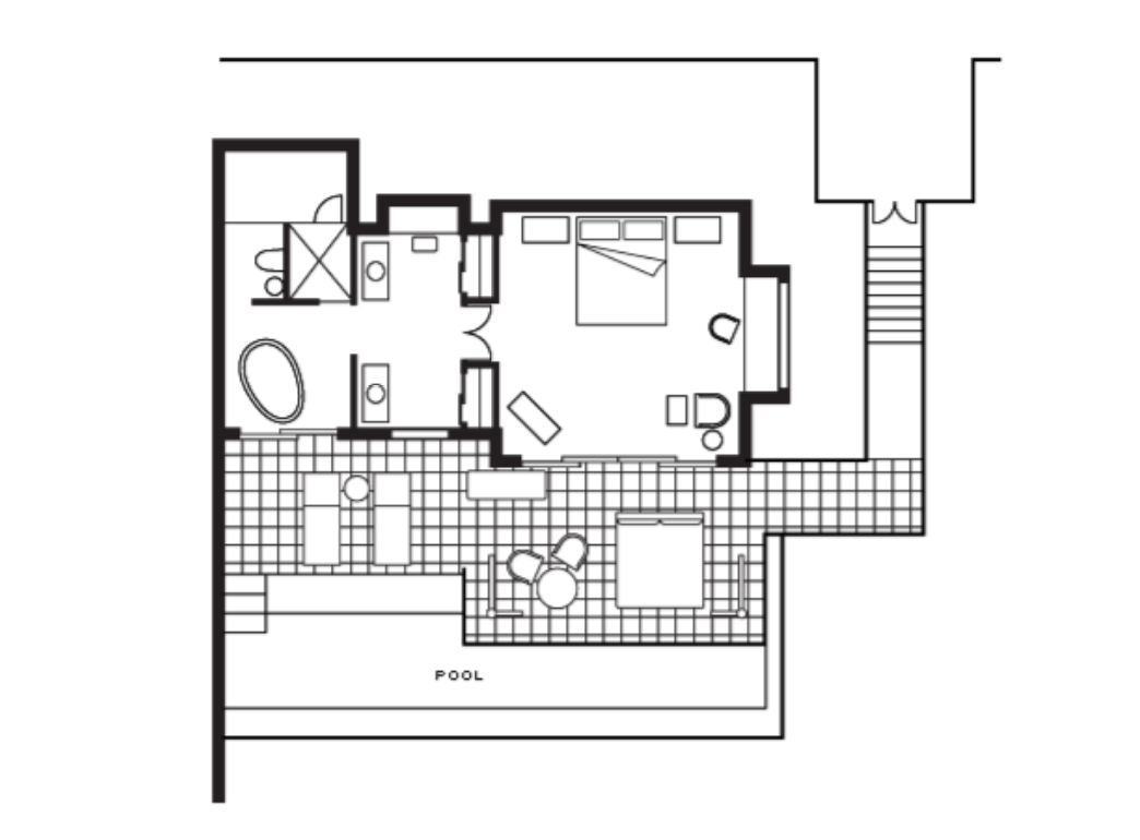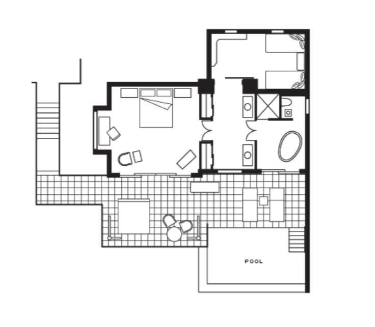 2 спальни: двуспальная кровать king-size и две односпальные кровати, одна раскладная кровать или одна детская кроватка, ванная комната с ванной и душем, терраса, небольшой частный бассейн (15 м²), вид на сад, см.план номера;