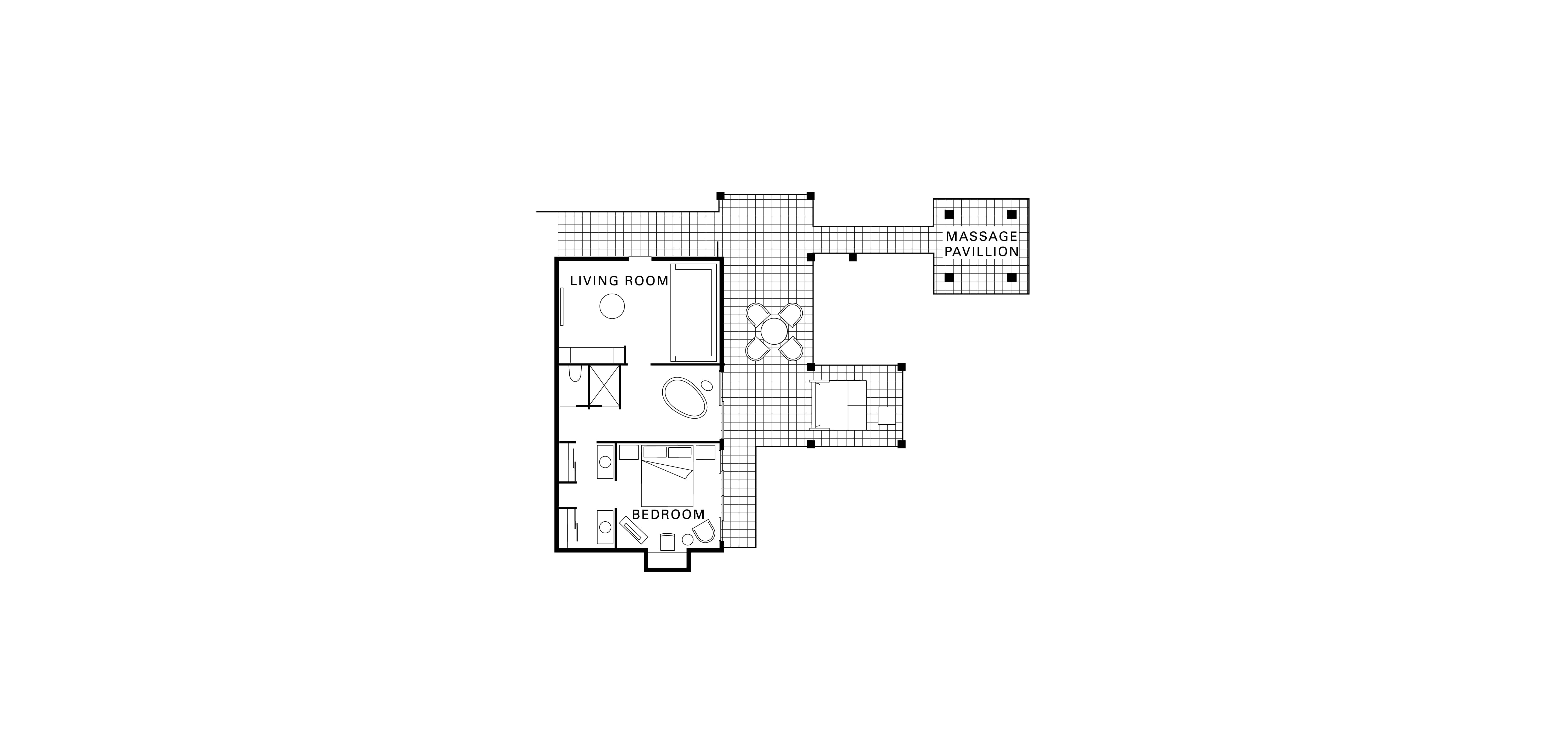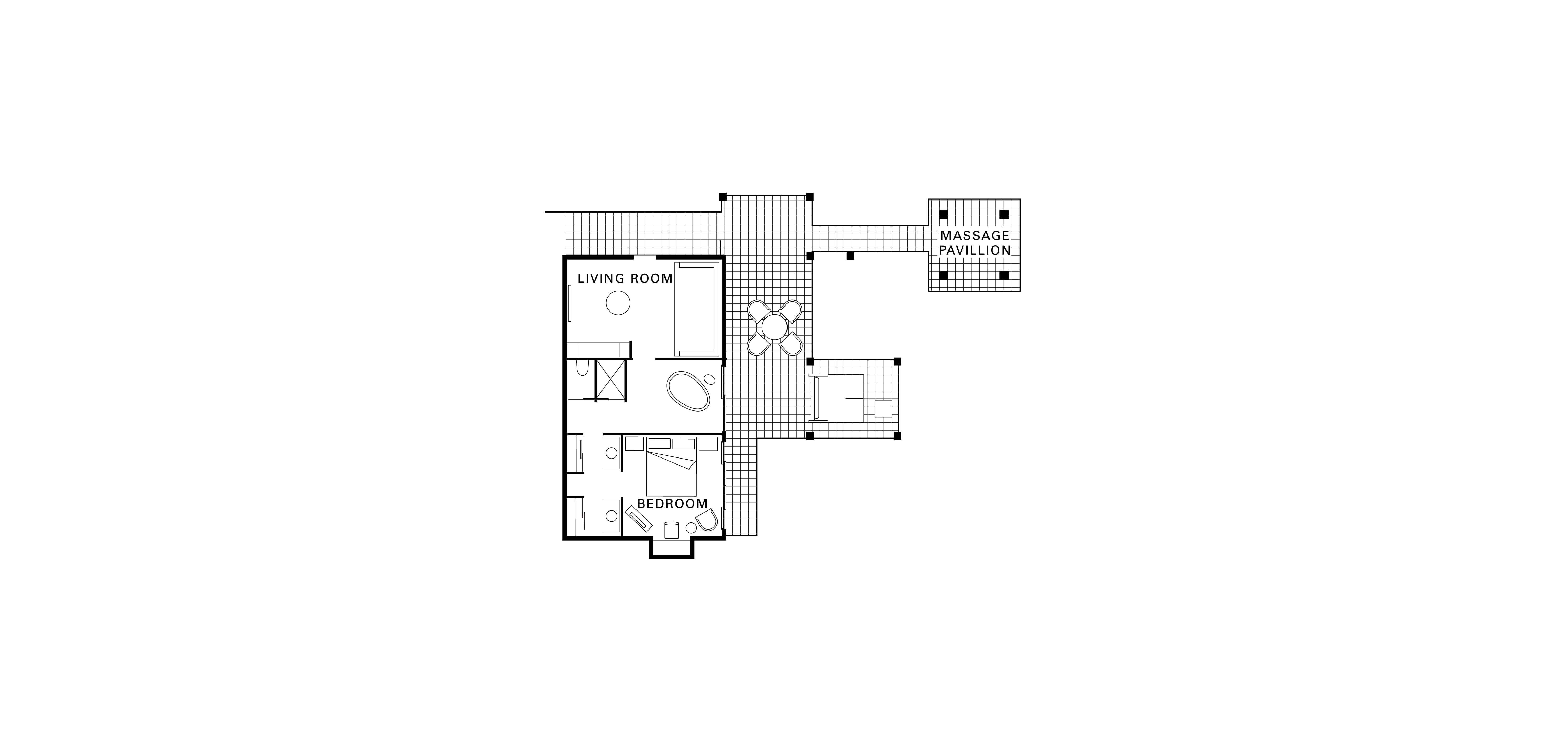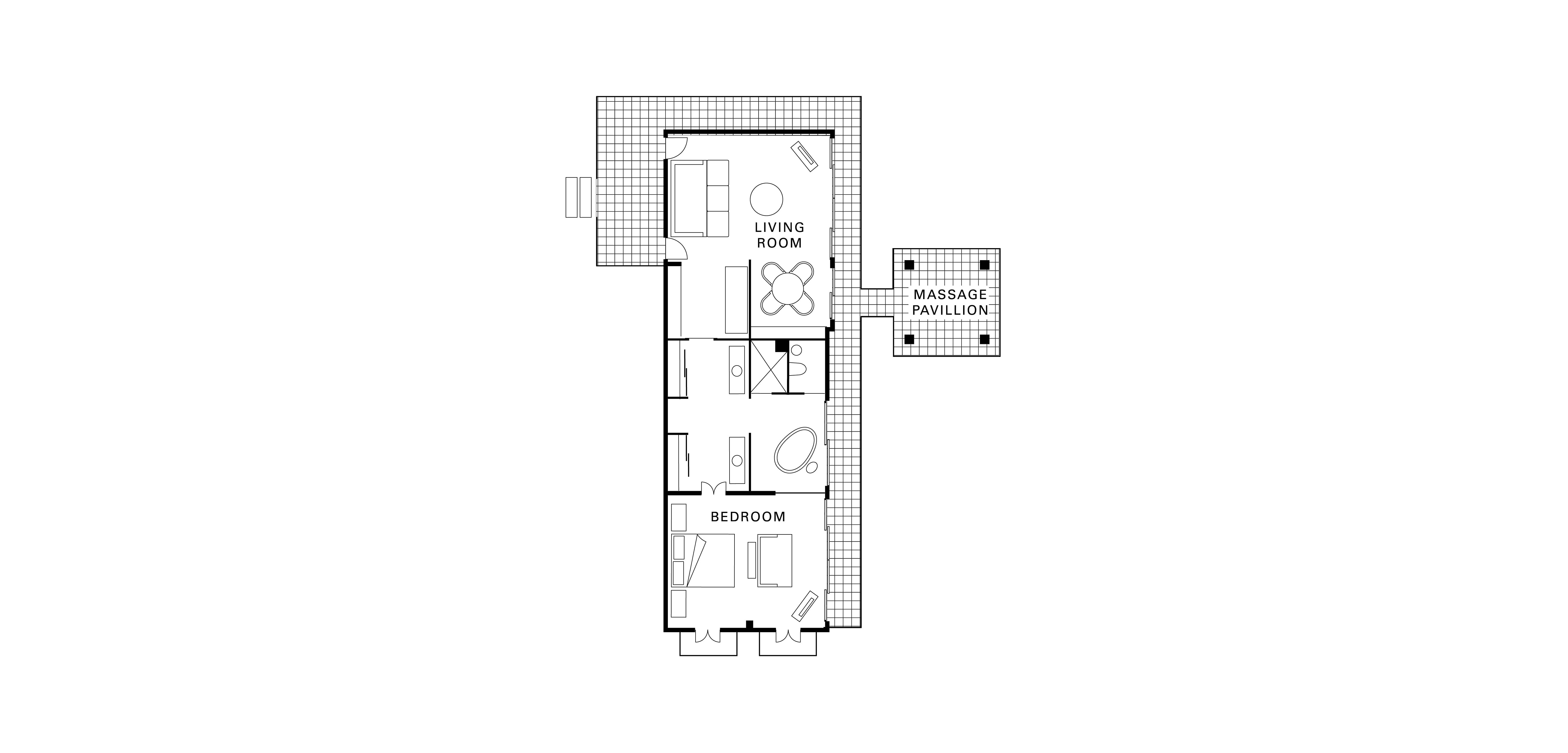2 спальни: двуспальная кровать king-size и две односпальные кровати, одна раскладная кровать или одна детская кроватка, ванная комната с ванной и душем, терраса, небольшой частный бассейн (15 м²), вид на сад, см.план номера;