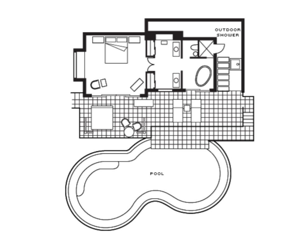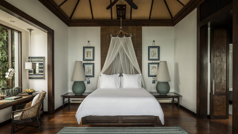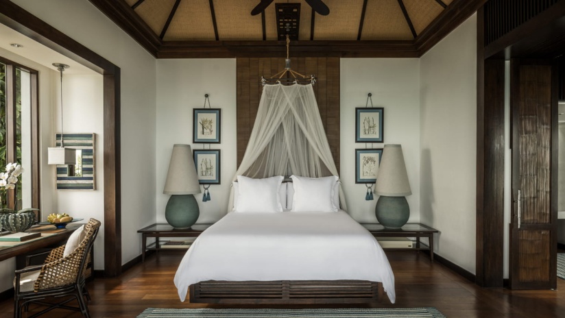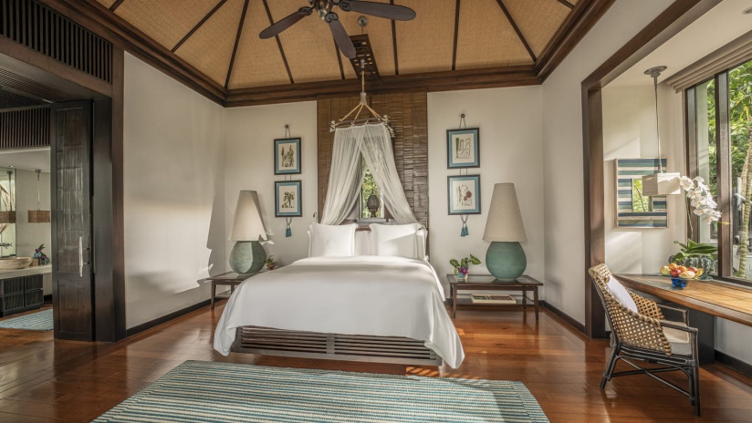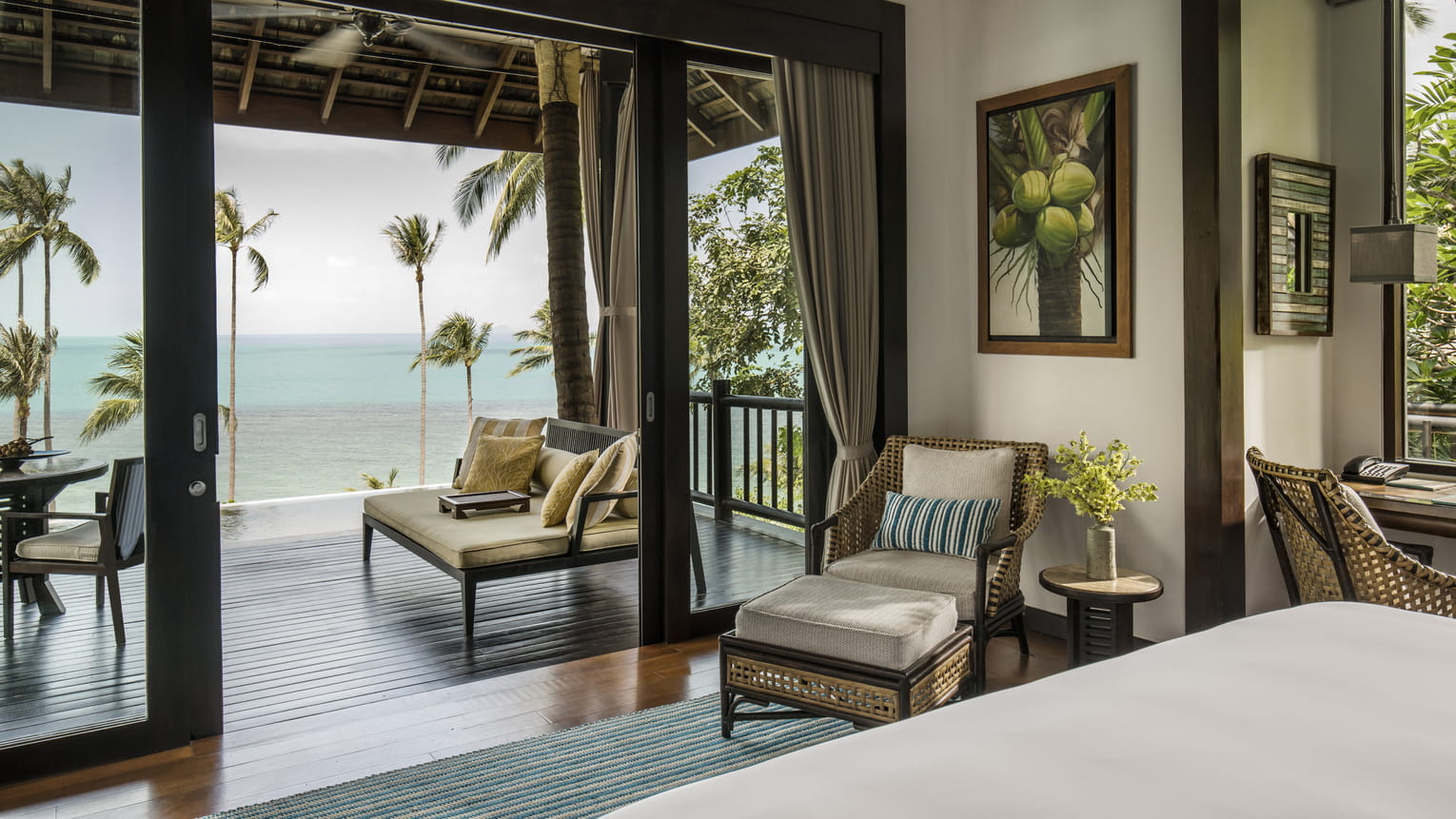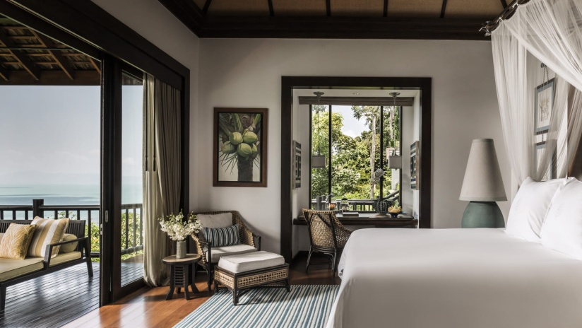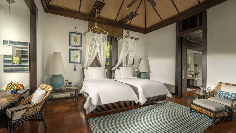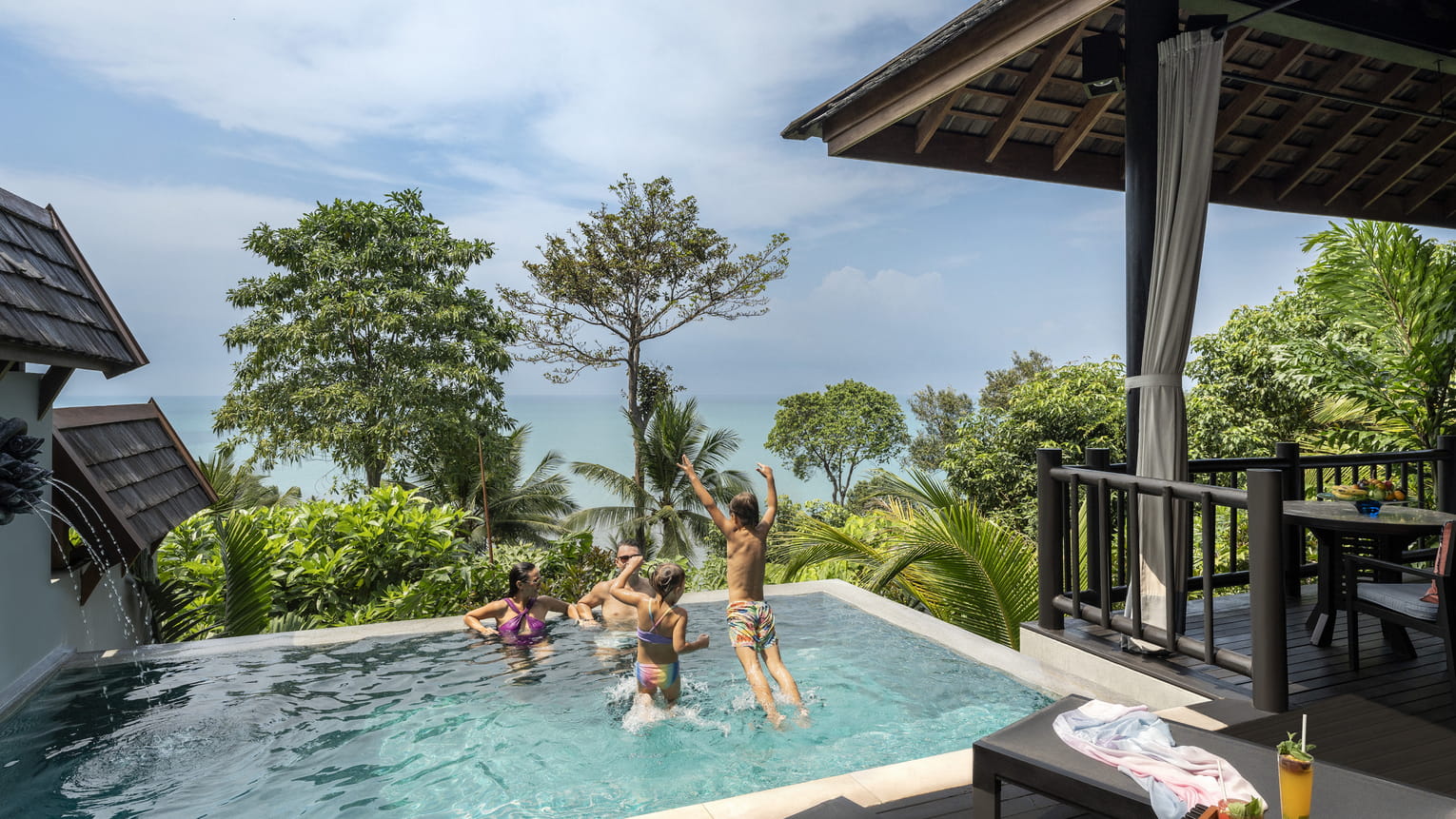 Одна двуспальная кровать king-size, одна раскладная кровать или одна детская кроватка, ванная комната с ванной, тропический душ на открытом воздухе, персональный бассейн, вид на Сиамский залив, прямой доступ к частному пляжу курорта, см. план номера;