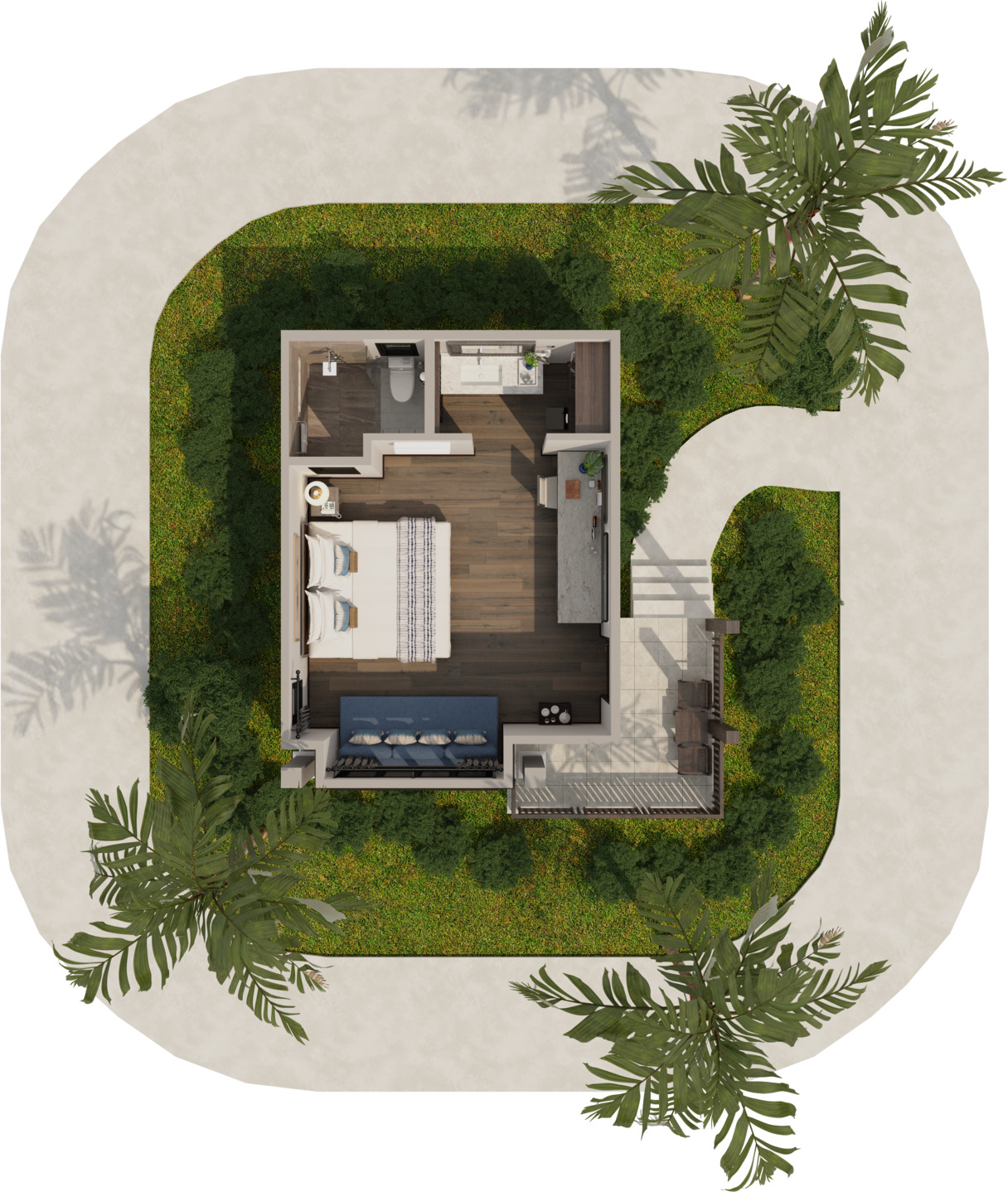 Отдельная вилла с открытой планировкой: спальня с двуспальной кроватью, гостиная зона с диваном и рабочая зона с письменным столом, кофемашина, ванная комната с душем и ванной, внутренний дворик с частным бассейном, шезлонгами и душем на открытом воздухе;