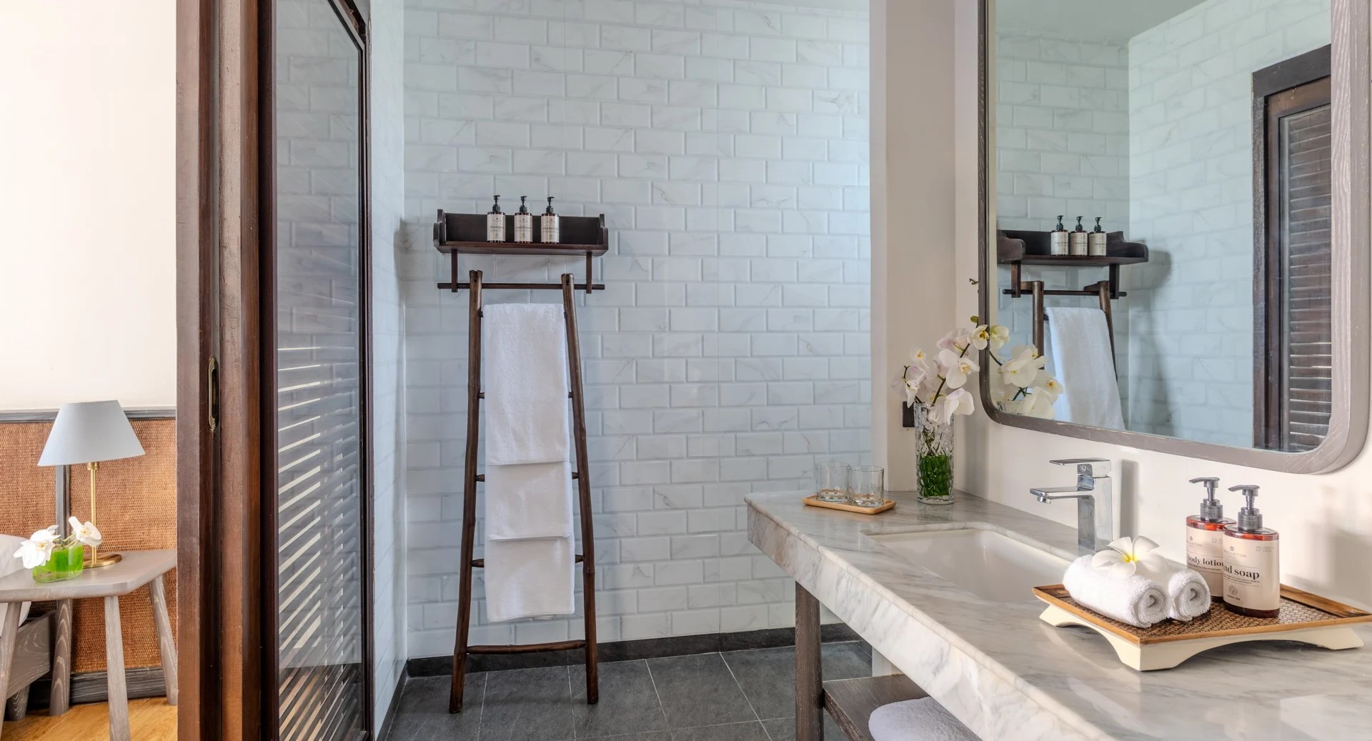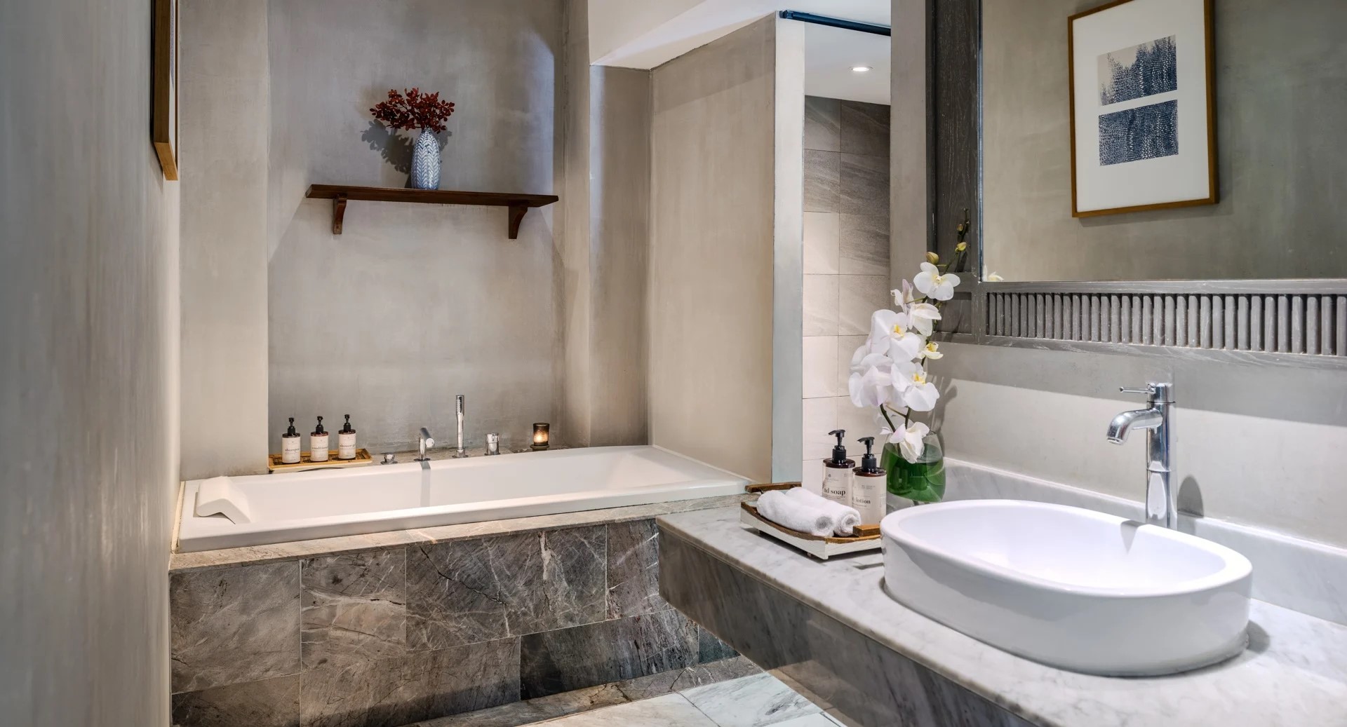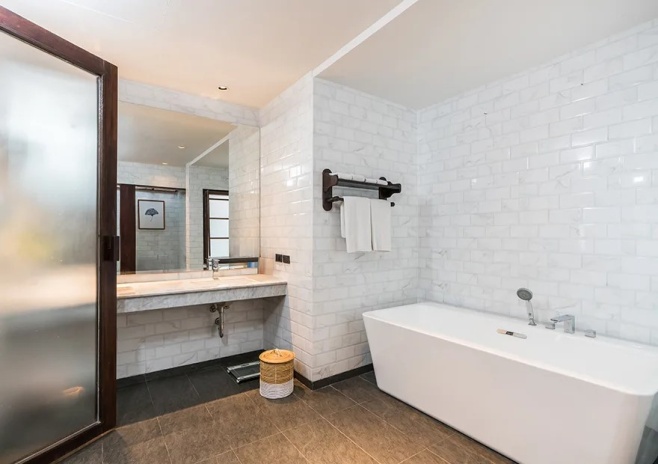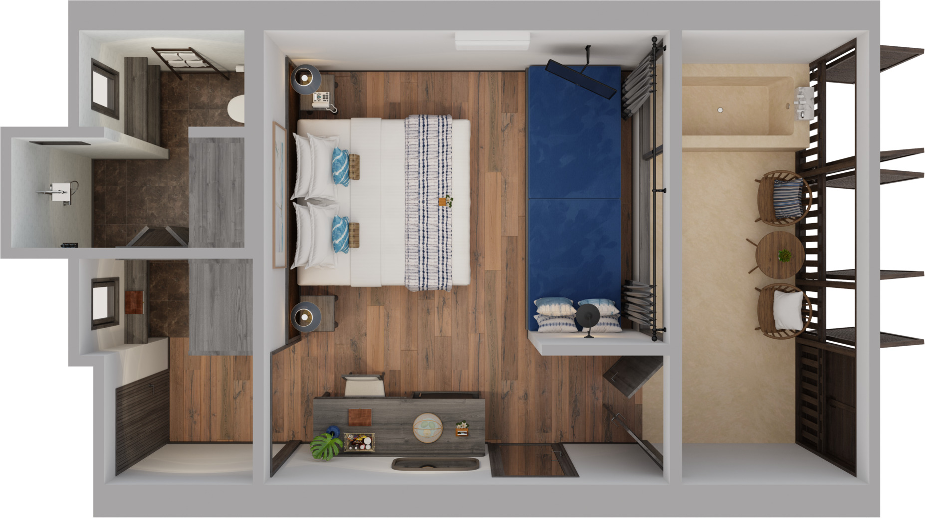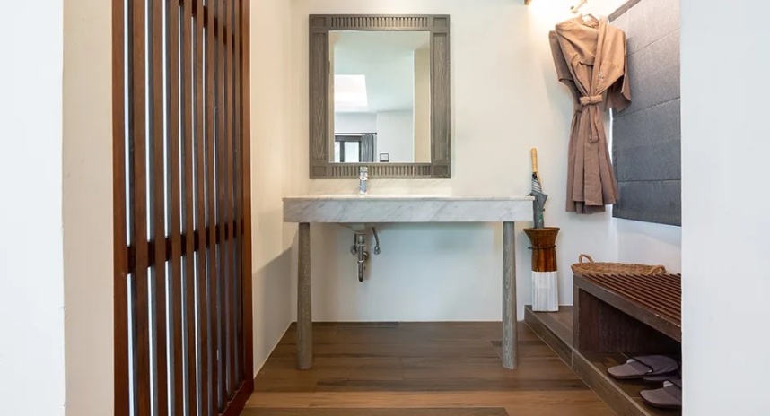 *в части номеров, сьютов и на виллах гардеробная комната/ шкаф-гардероб располагается в зоне ванной комнаты.