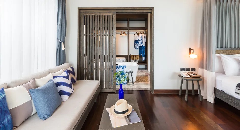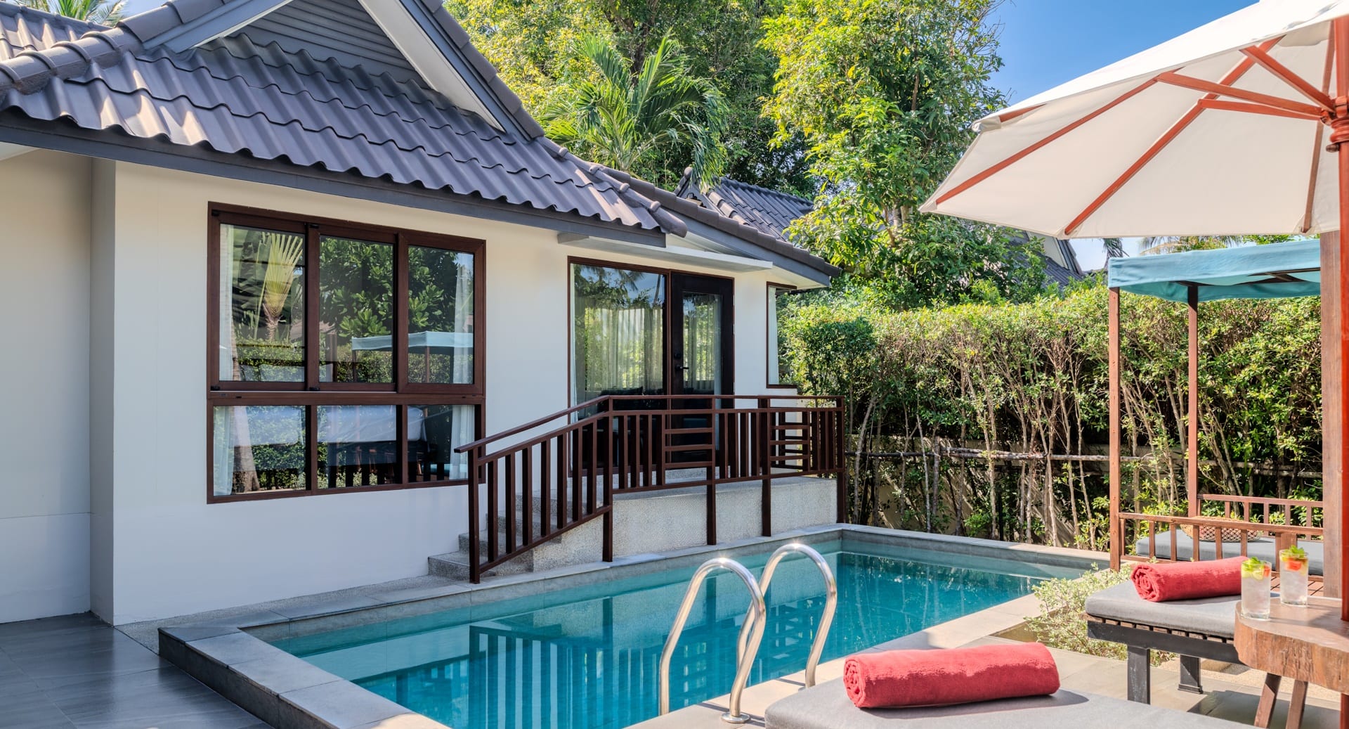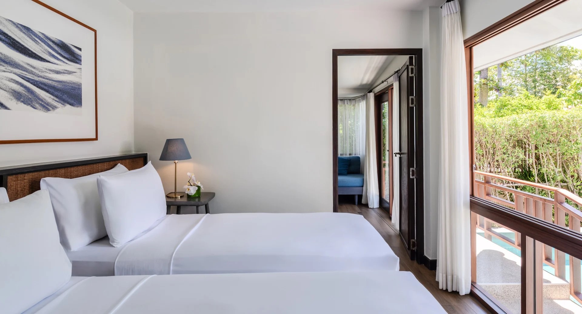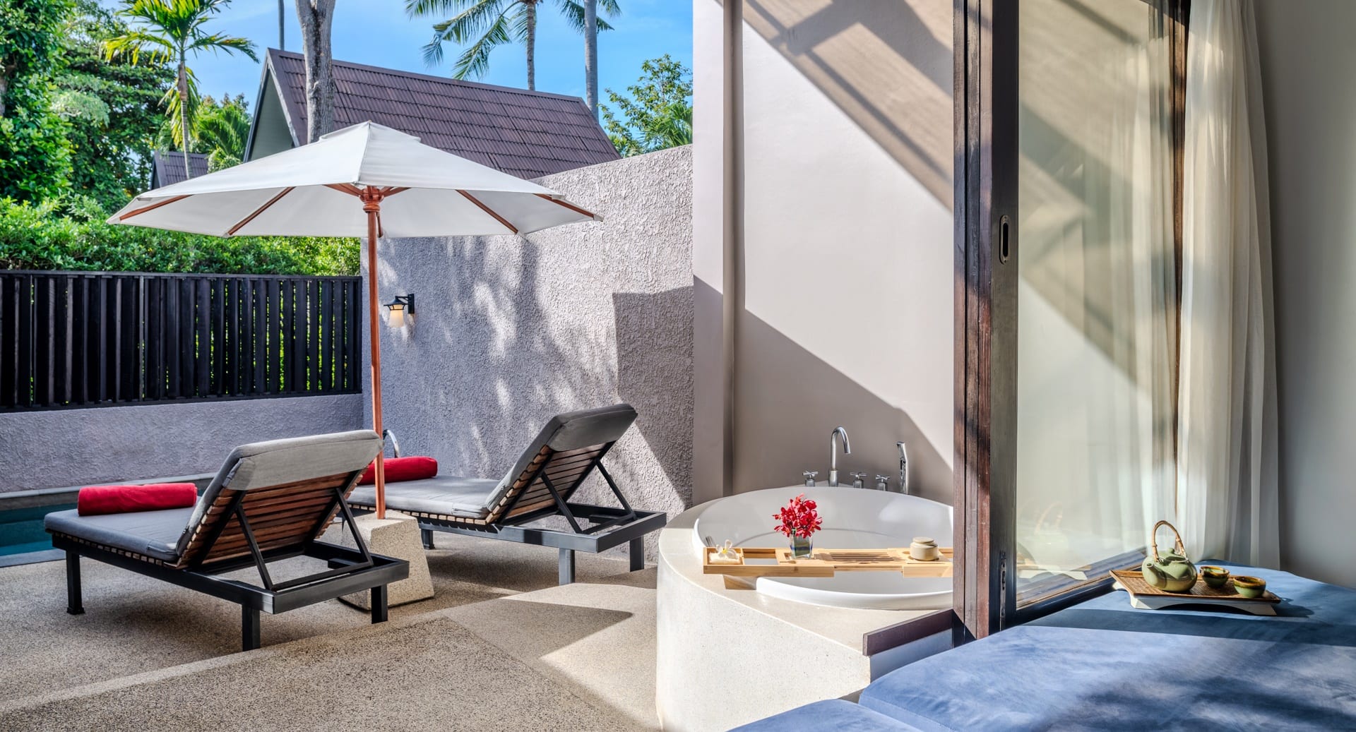 Отдельная вилла с 2-мя спальнями и межкомнатными дверьми: спальня с двуспальной кроватью, собственной ванной комнатой с душем, ванной и гардеробной; спальня с 2-мя односпальными кроватями с собственной ванной комнатой с душем; гостиная с диваном, кофемашина, терраса и дворик с частным бассейном, шезлонги, зонт, душ на открытом воздухе;