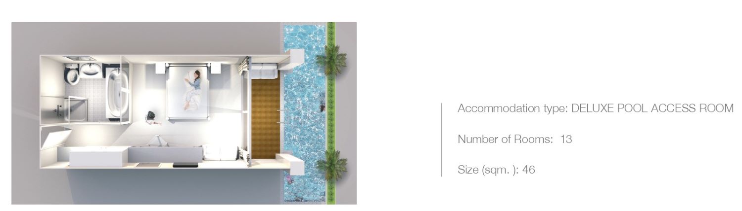 • 13 номеров Deluxe Pool Access (46 м², макс. 3 чел.).