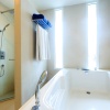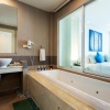 Номера на 1-м этаже трехэтажного корпуса: 1 двуспальная кровать king size или 1 двуспальная кровать king size + 1 односпальная кровать; отдельная ванная комната с ванной и душевой кабиной (отделена стеной с непрозрачным окном); меблированная терраса (9 м²) с кушеткой, спуск в  открытый бассейн, расположенный вдоль корпуса; вид на главный бассейн; план номера;