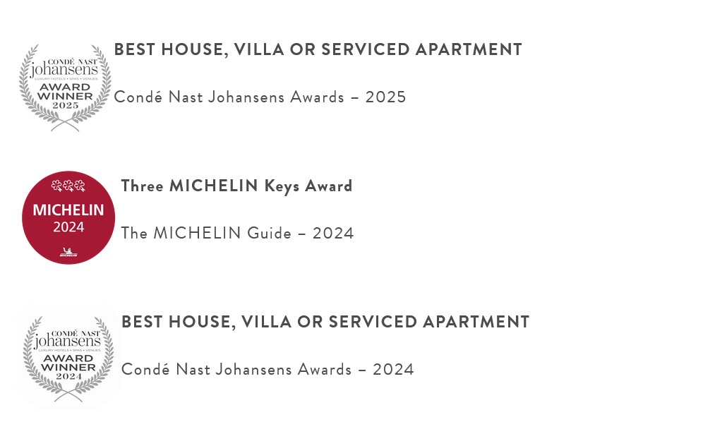 • Samujana отмечен тремя «ключами»  Мишлен* / Three Michelin Key и удостоен премии Condé Nast Johansens Award of Excellence в номинации «Лучшие виллы и дома» в 2024 и 2025 годах (награды отеля).