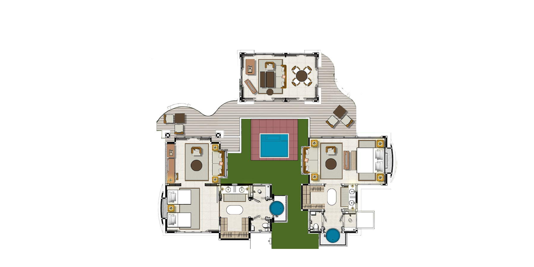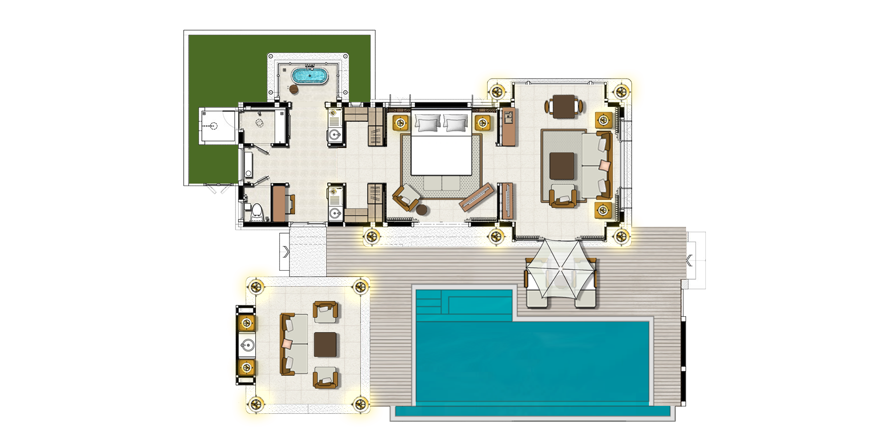 Спальня с двуспальной кроватью, отдельная гостиная комната с диваном, гардеробная, ванная комната с ванной и душем, терраса, персональный бассейн, см.план номера;