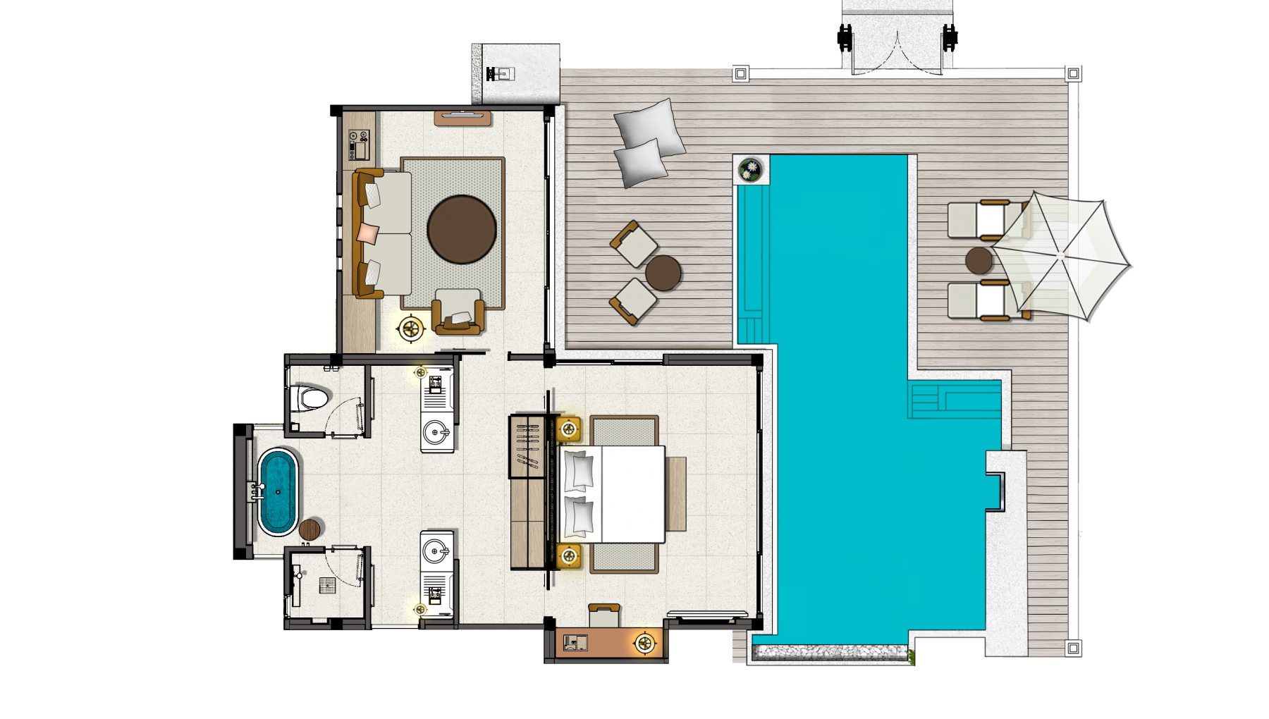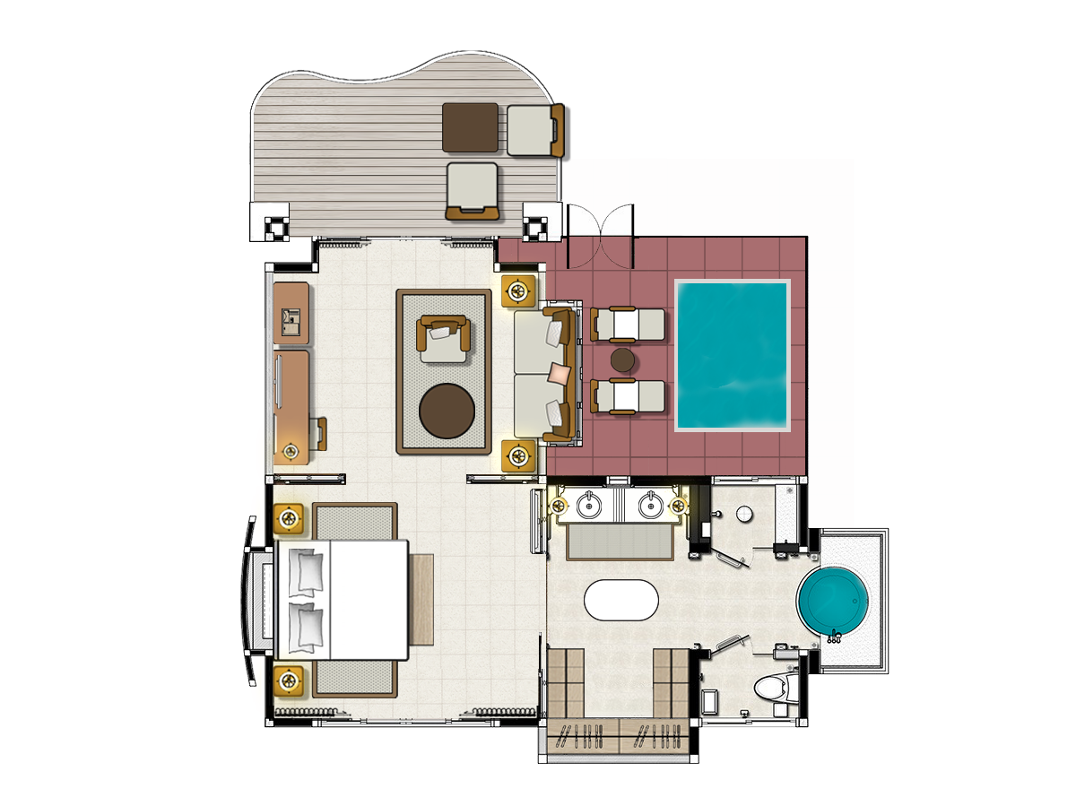 Спальня с двуспальной кроватью, отдельная гостиная комната с диваном, ванная комната с ванной и душем, терраса с зоной отдыха и лежаками, душ под открытым небом, персональный бассейн, см.план номера;