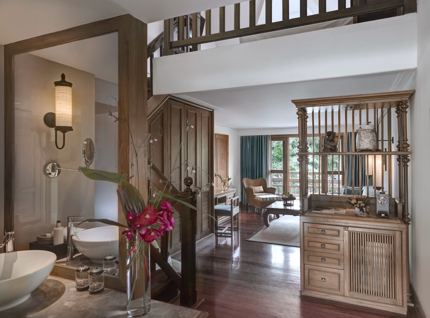 Двухуровневый номер, спальня на первом этаже, отдельная гостиная комната с диваном на втором этаже, ванная комната с душем, балкон (7 м²), вид на бассейн и сад, cм.план номера;