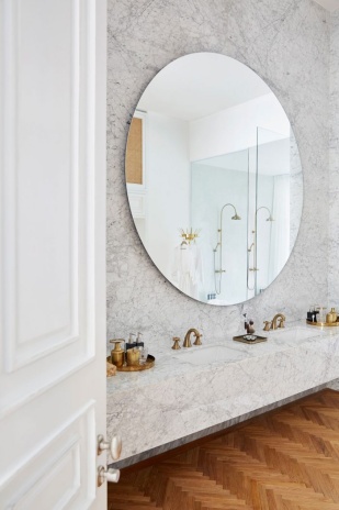 Кровать изготовленная на заказ шириной примерно 3,35 метра, гостиная зона с диваном, гардеробная, ванная комната с гидромассажной ванной, 2 раковинами и душем;