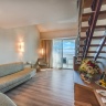 Двухуровневые номера расположены на верхнем этаже отеля, спальня с двуспальной кроватью, гостиная комната с 2 диванами-кроватями, 2 ванные комнаты с душем, балкон, вид на море;