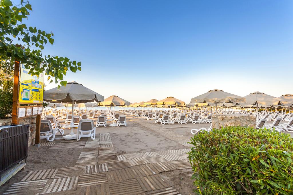 собственная песчаная пляжная зона в 100 метрах от отеля (лежаки и зонтики — бесплатно)