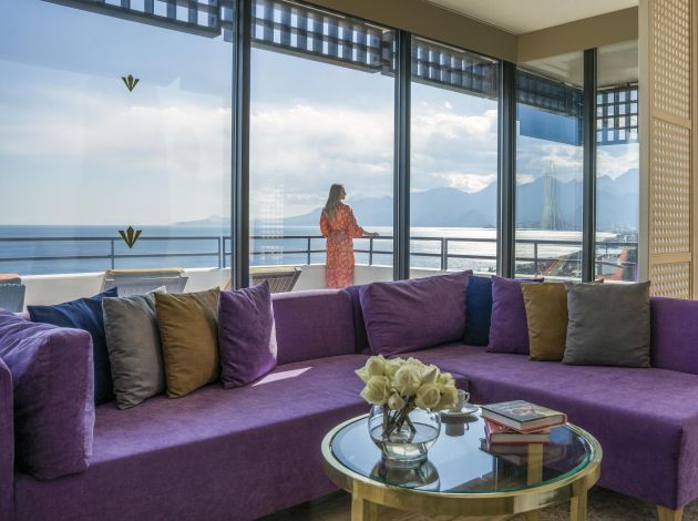 Спальня с двуспальной кроватью king-size, гостиная комната с диваном, 2 ванные комнаты, балкон, вид на море, виртуальный тур по номеру;
