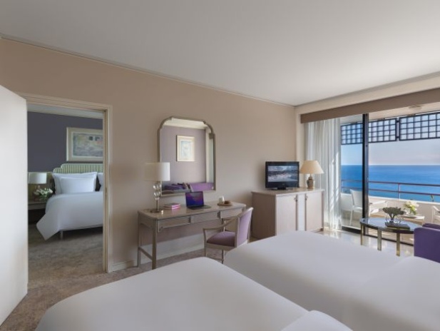 Двуспальная кровать king-size или 2 односпальные кровати (размер односпальной кровати – 100 х 200 см), 2 дивана (размер дивана – 80 х 190 см), ванная комната с душем, балкон, вид на море, виртуальный тур по номеру;