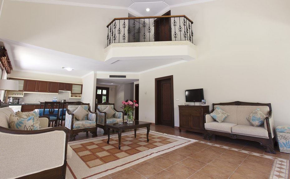 Двухэтажные виллы, на нижнем этаже находится спальня (французская кровать) с собственной ванной комнатой, американская кухня, гостиная и туалет. На верхнем этаже есть две спальни (французская кровать) с отдельными ванными комнатами, и одна из этих ванных комнат с джакузи, частный сад;