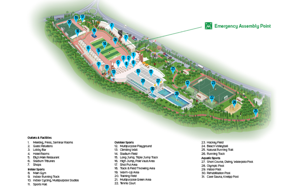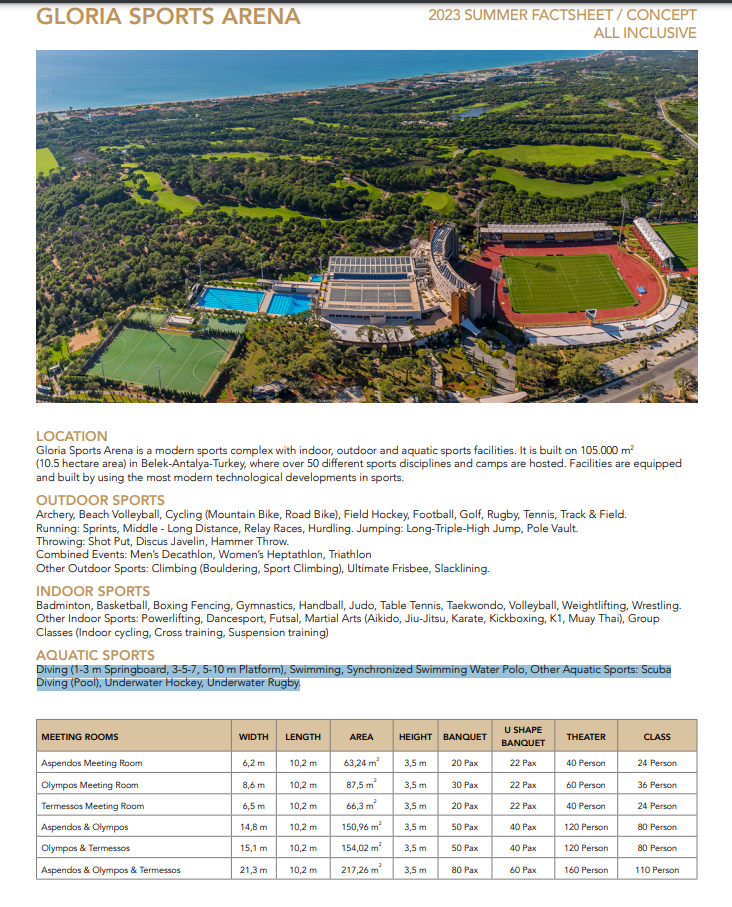 Gloria Sports Arena, см.карту, см.схему — современный спортивный комплекс с крытыми, открытыми и водными видами спорта. Он построен на площади 105 000 м² для более чем 50 спортивных дисциплин, см.описание: