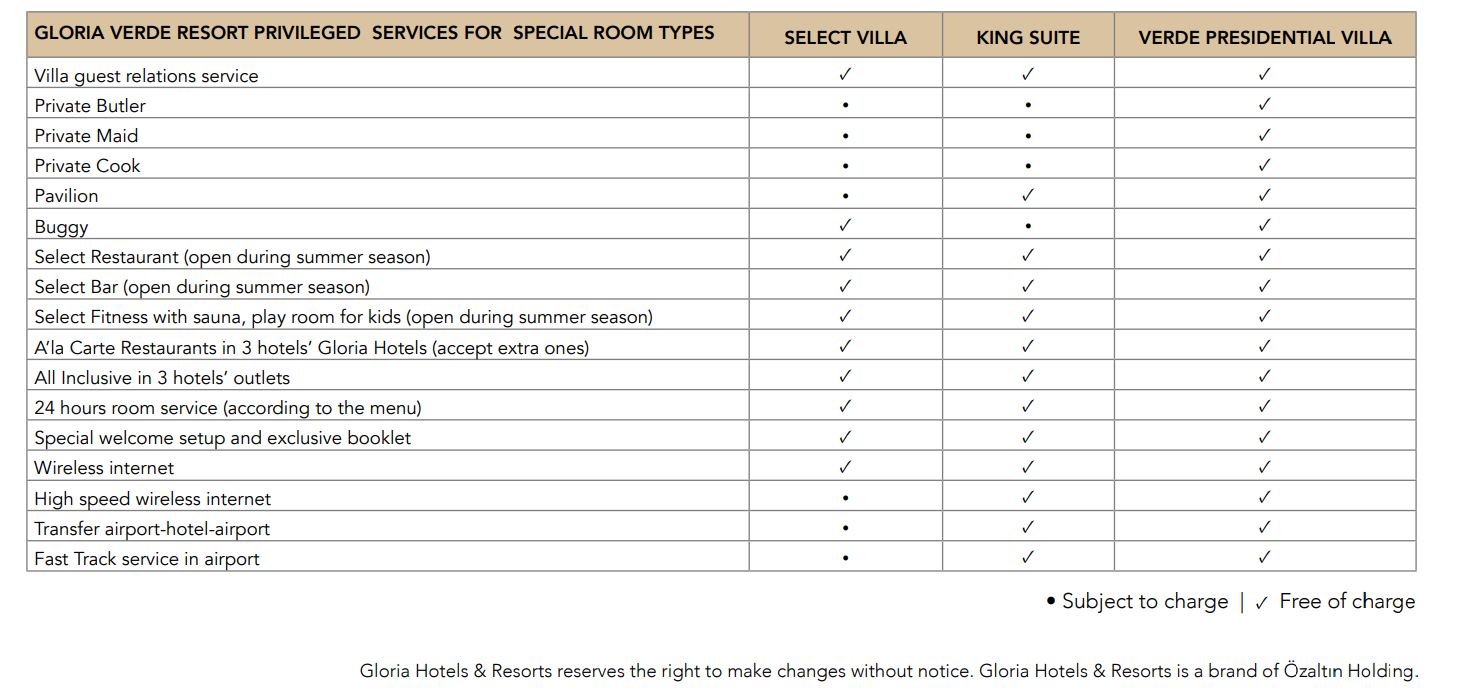 Комплекс, состоящий из трех отелей Gloria Golf Resort, Gloria Verde Resort и Gloria Serenity Resort. Гостям, проживающим в сети отелей Gloria, групповые уроки гольфа предоставляются бесплатно в летний период – по предварительному бронированию.