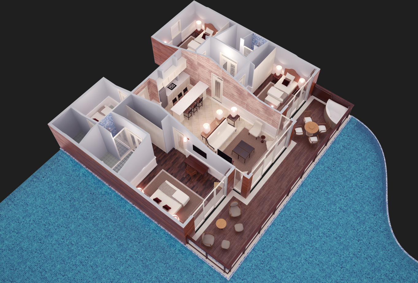 Номера расположены рядом с пляжем, 3 спальни: двуспальная кровать и 4 односпальные кровати, 3 ванные комнаты, отдельная гостиная комната с американской кухней, комната для няни с ванной комнатой, терраса с зоной отдыха, частный бассейн (200 м³), вид на бассейн (бассейн не работает зимой), услуги дворецкого;
