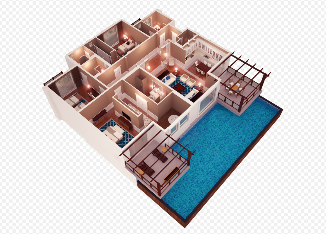 3 спальни: одна спальня с двуспальной кроватью и отдельной ванной комнатой, две спальни с двуспальными кроватями и общей ванной комнатой, отдельная гостиная комната с американской кухней, комната для няни с ванной комнатой, терраса с прямым доступом к общему бассейну, вид на бассейн (бассейн не работает зимой), услуги дворецкого, план номера;