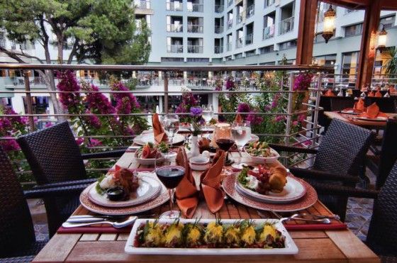 главный ресторан “Pinea”. Общая вместимость – 1200 человек. На “шведском столе” с международными и национальными блюдами каждый посетитель найдет себе что-нибудь по вкусу. Также предлагаются диетические меню и детский стол. ресторан “Dynasty” с турецкой кухней “a la carte”, где гостям будет предложен большой ассортимент блюд национальной турецкой кухни. ресторан “Laila” с итальянской кухней “a la carte”. Здесь гостей ожидает изысканные образцы итальянской кухни и уютная атмосфера. ресторан “Sushida” с японской кухней “a la carte” . ресторан “El Saguaro” с мексиканской кухней “a la carte”. Гурманы будут приятно удивлены блюдами, предлагаемыми в мексиканском ресторане. ресторан “Tandoori” с индийской кухней “a la carte” . Приглашаем всех наших гостей отведать экзотические блюда индийской кухни. ресторан «Poseidon” предлагает свежую рыбу и морепродукты. снек бар Likya, общая вместимость которого 150 человек, расположен около главного бассейна и предлагает большой выбор лёгких закусок и прохладительных напитков. кондитерская «Laila» , где Вы можете насладиться самыми вкусными сладостями, приготовленные по специальным рецептам Lobby Bar - здесь круглые сутки предлагается широкий ассортимент алкогольных и безалкогольных напитков импортного и местного производства. бар на пляже представляет широкий ассортимент безалкогольных напитков и прохладного пива. бар у бассейна.