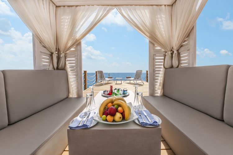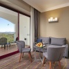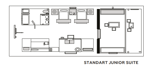 Номера расположены в основном здании, спальня с двуспальной кроватью, отдельная гостиная комната с диваном и обеденным столом, 2 ванные комнаты (ванна или душ), терраса (45 м²) с лежаками, вид на море, план номера;