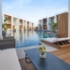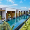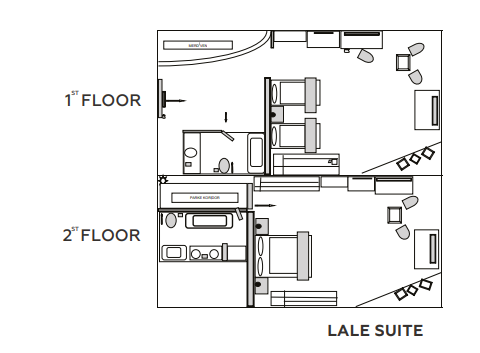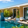 Расположены в зоне вилл, двухуровневые номера, 2 спальни: двуспальная кровать (180х210 см) на втором этаже, 2 односпальные кровати (110x210 см) на первом этаже, 2 ванные комнаты с ванной и душем, балкон и терраса, вид на сад или бассейн, план номера;