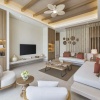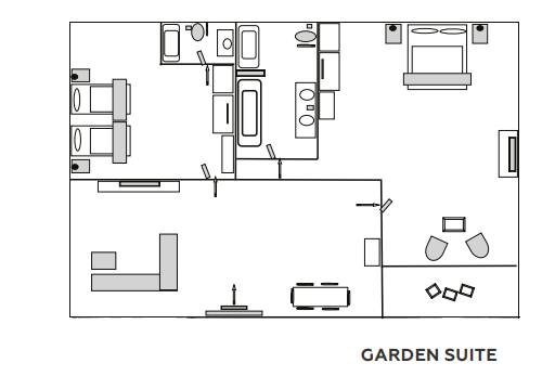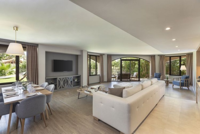 Расположены в зоне вилл, 2 спальни: двуспальная кровать (180х210 см) и 2 односпальные кровати (110x210 см), отдельная гостиная комната с диваном и обеденным столом, 2 ванные комнаты, балкон или терраса, вид на сад, план номера;