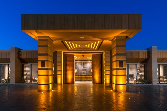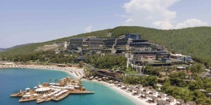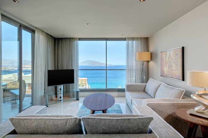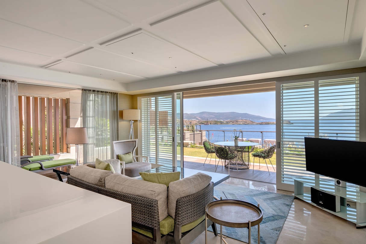 Caresse, a Luxury Collection Resort & Spa современный фешенебельный отель, раскинувшийся на самом берегу Эгейского моря, состоит из главного 5-этажного здания с лифтами и семи 2-этажных блоков. Каждая деталь отеля напоминает о водной стихии: дизайн интерьеров, лаконичный и сдержанный, выдержан в бежевых, голубых и бирюзовых тонах, а открытые террасы созданы для того, чтобы любоваться дивными морскими видами.