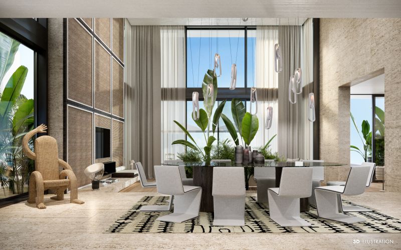 Частная вилла с лифтом и видом на море, 5 спальных комнат: 2 двуспальные кровати и две односпальные кровати -первый этаж, 2 двуспальные кровати - верхний этаж, гардеробная, гостиная комната с диваном, обеденным столом, барной стойкой и кухней, 6 ванных комнат с душем, комната с тренажерами, парная, сауна, прачечная, комната батлера, балкон, терраса, частный бассейн с морской водой и подогревом, павильон на пляже.