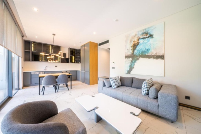 2 спальни с двуспальными кроватями, 1 ванная комната, 2 туалета, кухня (холодильник, посудомоечная машина, встроенная духовка), гостиная зона, балкон или терраса;