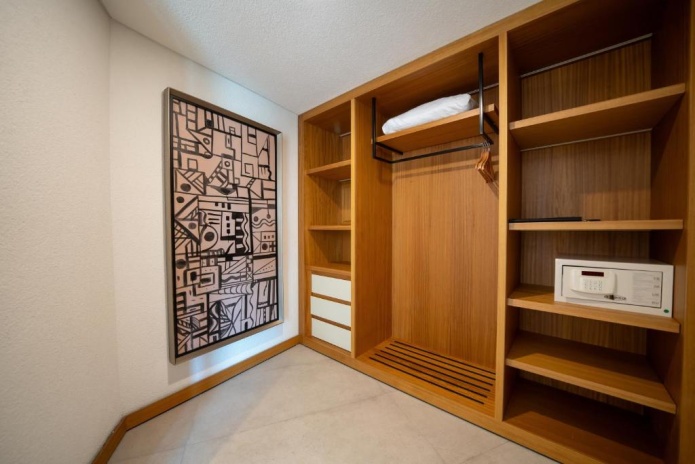 5 спален с двуспальной кроватью в каждой (3 спальни на верхнем этаже, 2 спальни на первом этаже), 5 ванных комнат, 6 туалетов, кухня (холодильник, посудомоечная машина, встроенная духовка), гостиная (гостиный уголок, обеденный стол), лифт, частный бассейн (55 м²), терраса, лежаки и зонтики, услуга «подготовки постели ко сну».