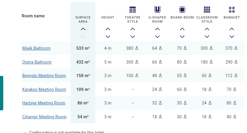 • 6 конференц-залов: банкетный зал Majik (533 м²) на 380 гостей, банкетный зал Opera (432 м²) на 300 гостей, зал Beyoglu  (150 м²) на 112 гостей; Karakoy  (109 м²) на 70 гостей, Harbiye (86 м²) на 80 гостей, Cihangir (54 м²) на 40 гостей, см.характеристики;