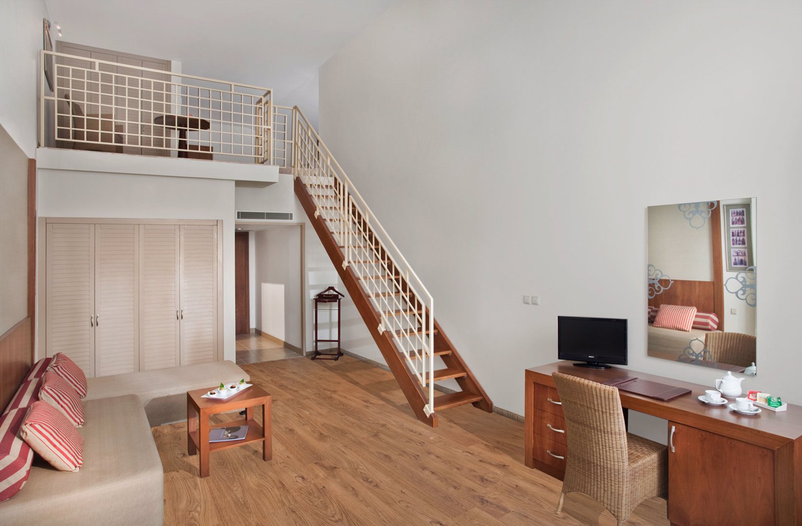 Двухэтажные номера, 2 спальни (двуспальная кровать, 2 односпальные кровати), 2 ванные комнаты (ванна на первом этаже, душ на втором этаже), диван-софа, балкон, вид на море;