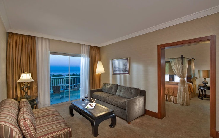 Двуспальная кровать или 2 односпальные кровати, гостиная с диваном-софа, ванная комната с ванной, балкон, боковой вид на море;