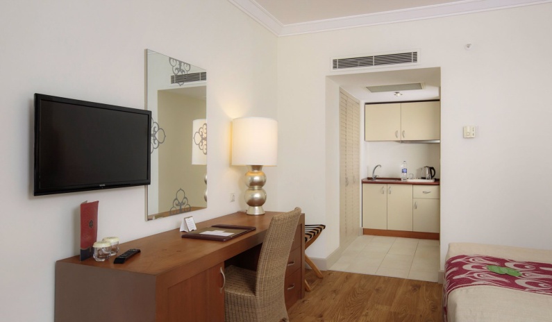 В номерах: телевизор, мини-бар, Wi-Fi, зеркало для макияжа, фен, телефон, набор для приготовления чая/кофе, банные принадлежности, сейф, халаты и тапочки, центральное кондиционирование.