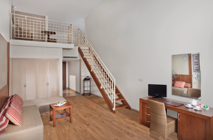 Двухэтажные номера, 2 спальни (двуспальная кровать, 2 односпальные кровати), 2 ванные комнаты (ванна на первом этаже, душ на втором этаже), диван-софа, балкон;