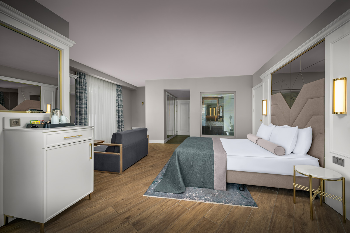• 124 номера Deluxe Room Side Sea View (28 м², макс. 3+1 или 2+2).