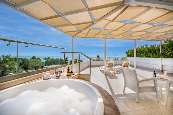 Двуспальная кровать, диван-софа, ванная комната с душем, терраса с лежаками и джакузи, прямой вид на море, пляжная сумка, десертная тарелка, в мини-баре также 2 банки пива.