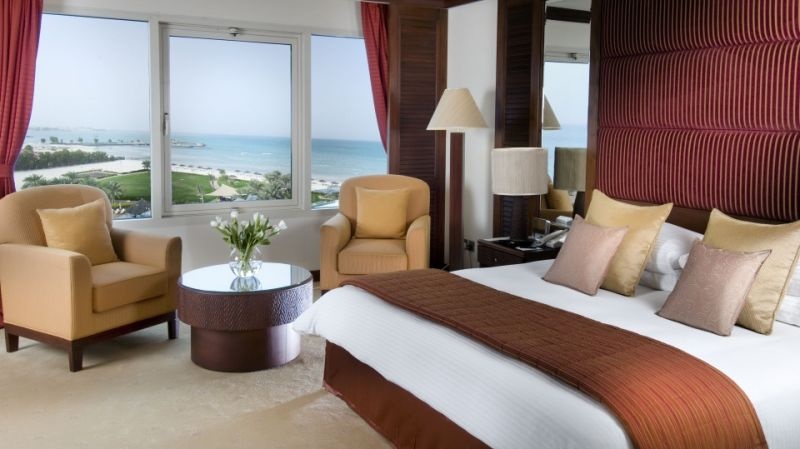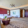 Двуспальная кровать, гостиная зона с креслами и диваном-софа, окна от пола до потолка, ванная комната с ванной и душем, вид на залив;