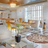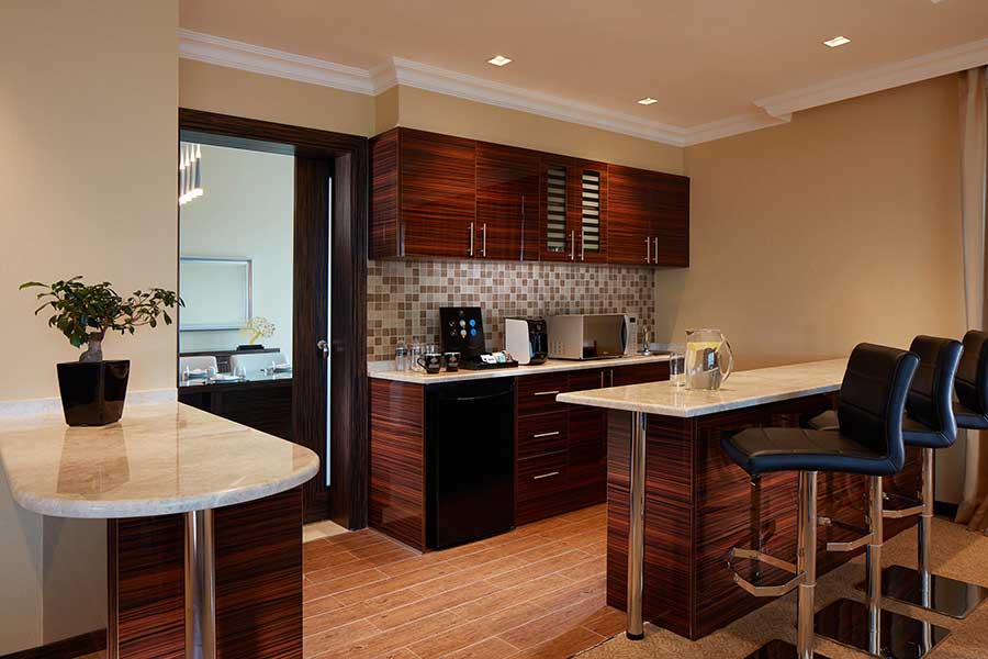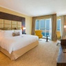 Спальня с двуспальной кроватью king-size, отдельная гостиная комната с диваном, обеденным столом и кухней, ванная комната с ванной и душем, окна от пола до потолка, план номера;