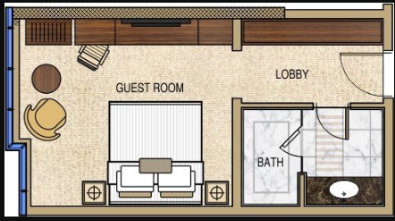 Двуспальная кровать king-size или 2 односпальные кровати, окна от пола до потолка, ванная комната с ванной, план номера;