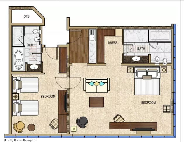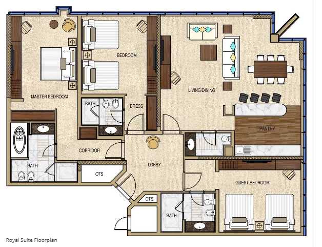 3 спальни: двуспальная кровать king-size и 4 односпальных кровати, 3 ванные комнаты (одна с ванной, другие с душем), отдельная гостиная комната с диваном и кухней, план номера;