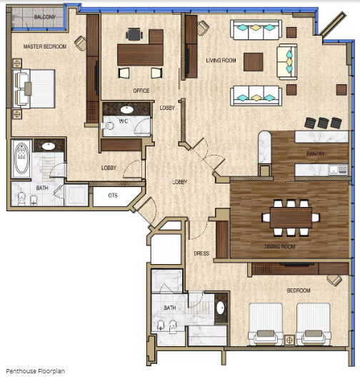 2 спальни: одна с двуспальной кроватью king-size, гостиной зоной с диваном, вторая с 2 односпальными кроватями, 2 ванные комнаты с ванной и душем, кухня, план номера;