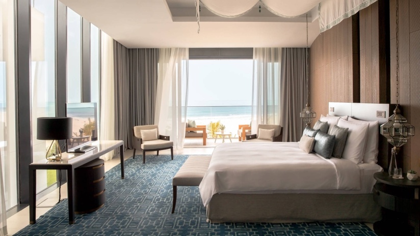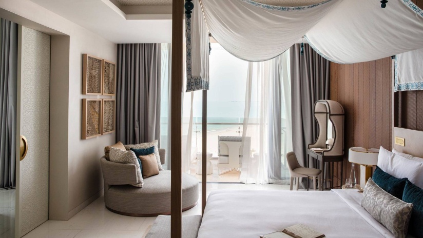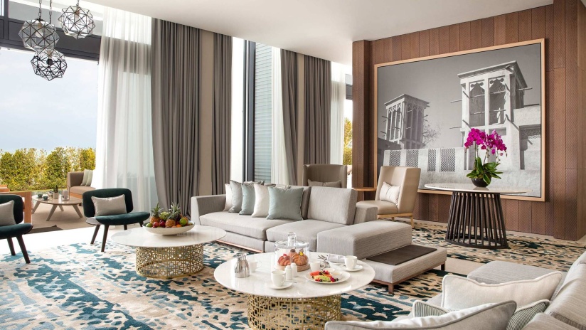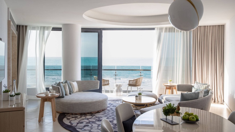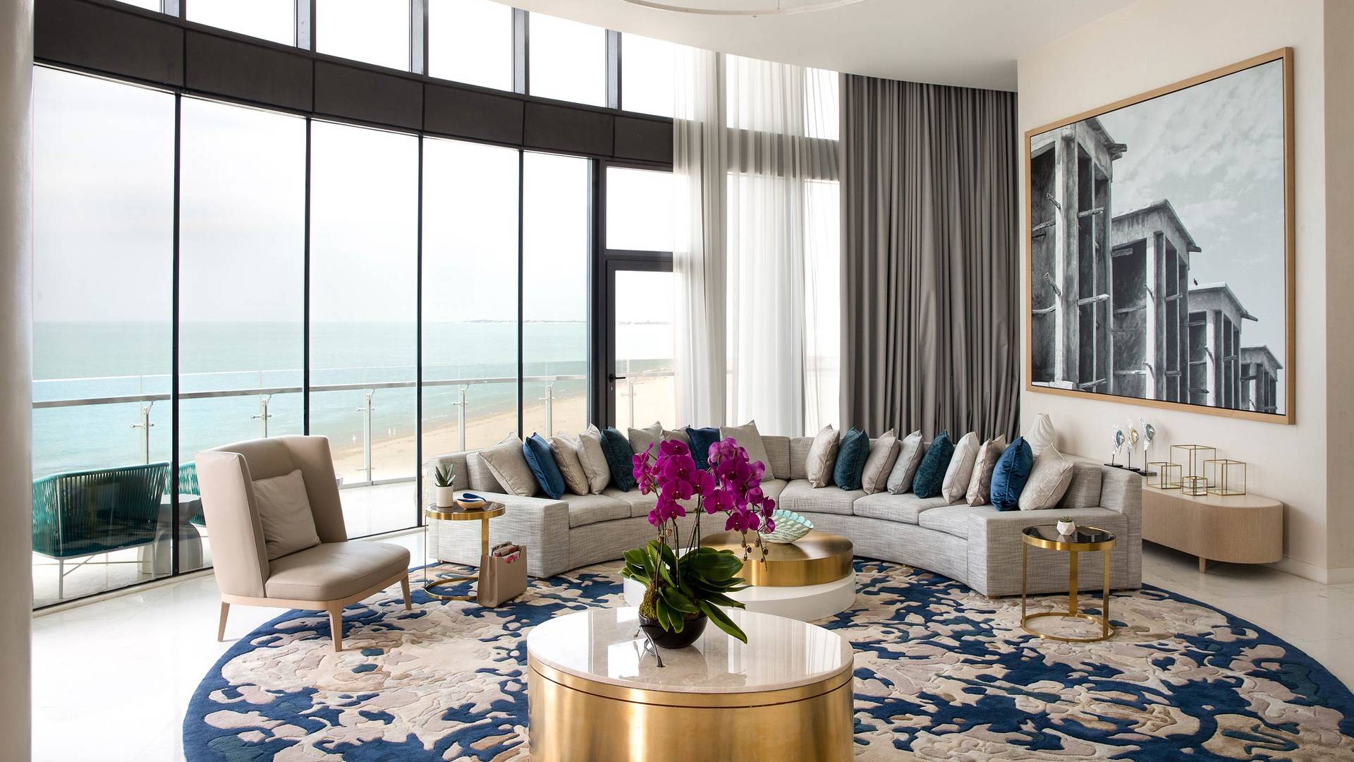 Расположен на верхнем этаже с собственным лифтом, окна от пола до потолка, высокие потолки, 2 спальни с двуспальными кроватями king-size, 2 ванные комнаты, отдельная гостиная комната с диваном и обеденным столом, просторный балкон, панорамный вид на Персидский залив, номер можно расширить до 4-х спален;