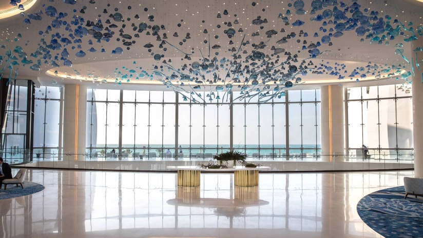Отель Jumeirah at Saadiyat Island расположен на острове Саадият около Абу-Даби. Планировка фойе позволяет гостям любоваться захватывающими видами на море. Главный акцент в интерьере — изысканная люстра весом 2000 килограмм в фойе, вручную изготовленная из богемского хрусталя. Светлые номера и люксы выполнены в нейтральной цветовой гамме и идеально подходят для спокойного отдыха. Для ценителей абсолютного уединения на курорте имеются элегантные виллы. К услугам гостей открытые бассейны, большой спа-центр, тренажёрный зал, несколько ресторанов, а также детский клуб и частный пляж.